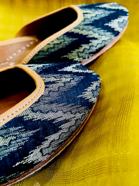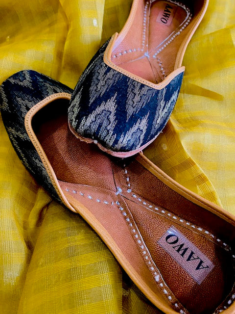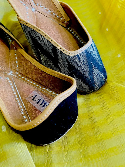 -Say hello to the Mojris you will reach out to most often: The ikkat fabric on this sports a striking pattern of black and grey with the typical blurriness of golden handloom ikkat. Elevate your casual look by pairing these with your everyday kurtas and jeans.