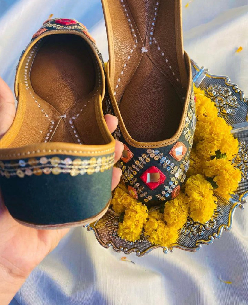 A sparkling interplay of mirror-work and floral motifs, this jutti is designed to make you stand out at any event. It is comfortably cushioned and something you’d want to add to your closet right away. Pair it up with your pastels, whites, and soft gold outfits, and have compliments coming your way.