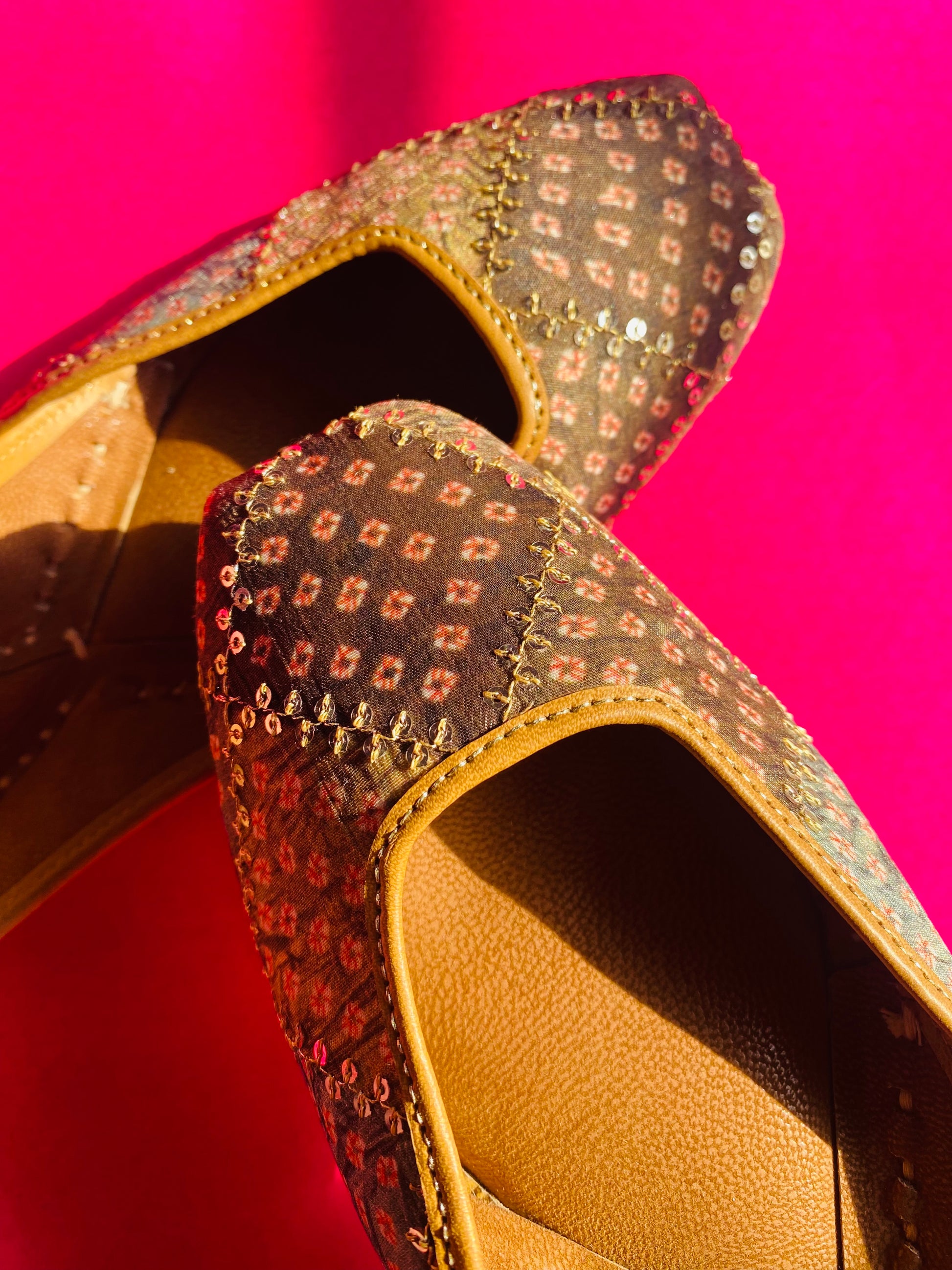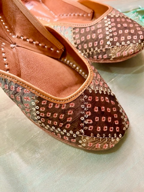 Design and hand embroidery with sequins work on a very delicate bandhej print .